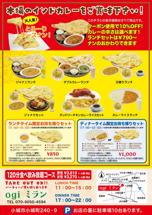 唐津で大人気のあのインドカレー屋さんが小城に移転してきてくれて初上陸!がばいヘルシーなダルカレー(豆入りカレー)720円から、定番のチキンカレー・キーマカレー・ポークカレー、さらには本格タイカレー(グリーンカレー)まで!辛さもお子様用の甘口、大人用の甘口からインド人もびっくりの激辛まで(20辛から以上は+100円)。タンドリーチキンやチーズナン、マンゴーラッシーなどサイドメニューもいろいろあってひと味違ったパーティや飲み会にも対応!ランチセットは790円からでナンorライス、カレー、サラダまでついてます!もちろん日本語ペラペラのスタッフさんでオーダーも全然日本語でOKなので安心して食べに行ってみんね。