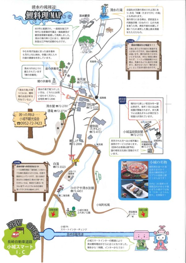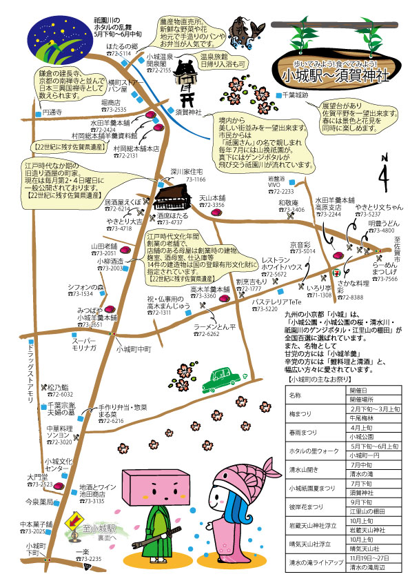 小城に来たら手作りマップ片手に散策してください。 小城町エリアA 須賀神社境内から小城の美しい町並みを一望できます。 小城町エリアB 小城公園は桜の名所です。 鯉料理 清水の鯉はひと味違う!! 冷たい清流に餌を与えず、1~2ヶ月程度さらされた鯉は、身が引き締まり、臭みもなくなり美味しくいただけます。 ~西の浪花~ 牛津町A 霊屋デパート発祥の地地に残る倉庫 ~西の浪花~ 牛津町B 映画「ソフトボール」のロケ地 牛津高校